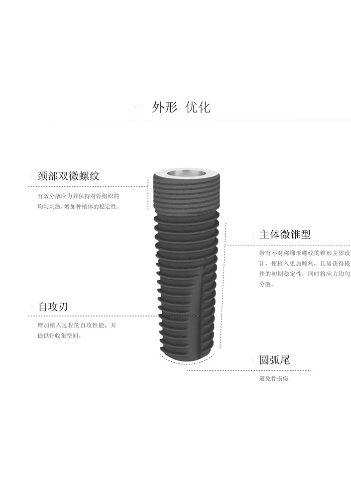 該設(shè)計較之圓柱形、單螺紋設(shè)計具有很好初期穩(wěn)定性,應(yīng)用于低密度骨質(zhì)優(yōu)越性會更加明顯。同時微錐外形和不對稱梯形主螺紋可以將牙種植體與骨周圍應(yīng)力進(jìn)行有效的分散,保證生理平衡,既不會因過載荷而造成骨吸收或種植體疲勞斷裂,亦不會因作用于骨的應(yīng)力過小引起組織萎縮而產(chǎn)生骨吸收。自攻切削刃設(shè)計可方便手術(shù)時順利植入,同時增加骨結(jié)合表面積。